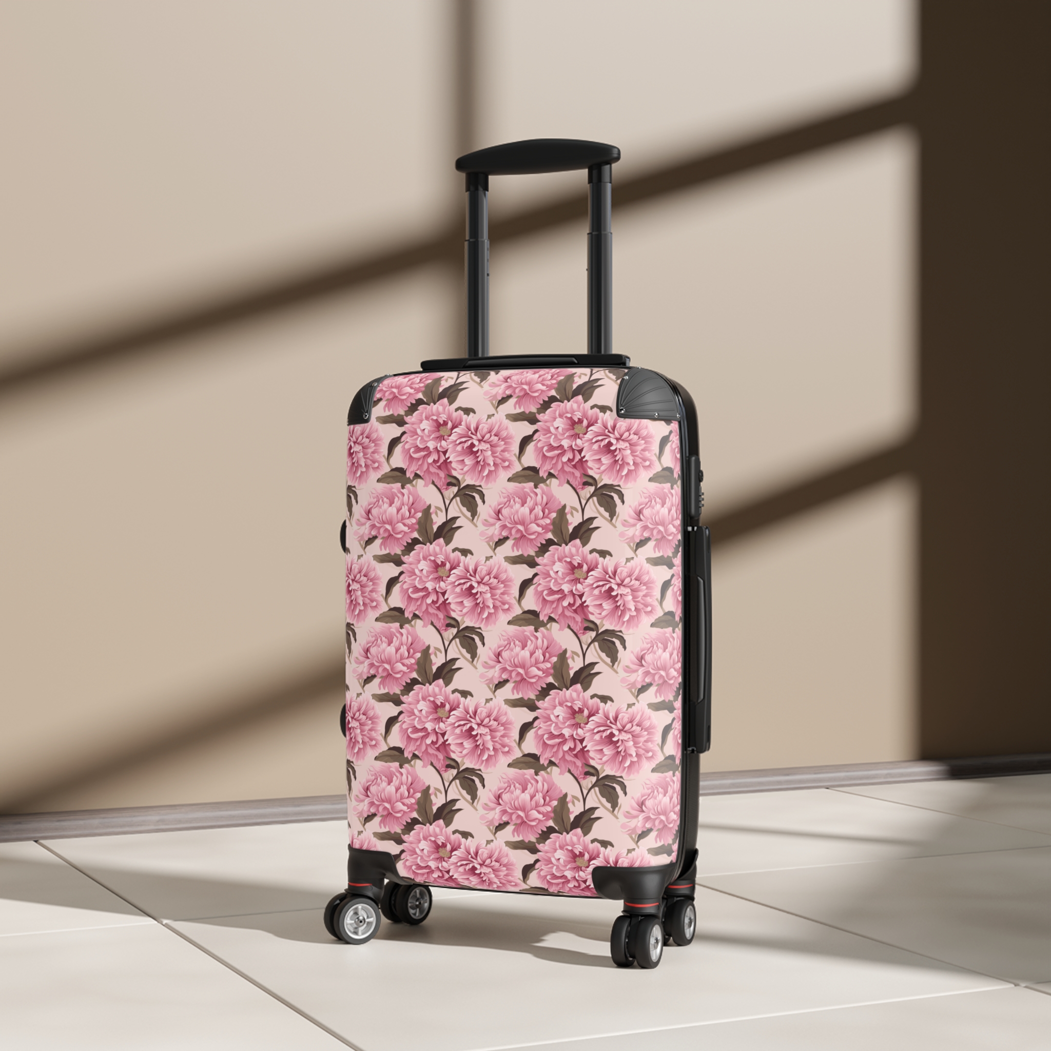 Carry a garden with you. This hard-shell suitcase pairs durable polycarbonate and ABS construction with a soft, romantic floral print — lush pink peonies set against a warm background. It feels both sturdy and personal: the removable lined interior keeps clothes neat, inner pockets hold chargers and toiletries, and the built-in lock gives quiet confidence at busy terminals. Four double 360° wheels and an adjustable telescopic handle make city streets and airport concourses effortless. The largest size offers an expandable top for extra finds on extended trips. For travelers who want function without losing femininity, this suitcase moves gracefully from weekend escapes to longer adventures.