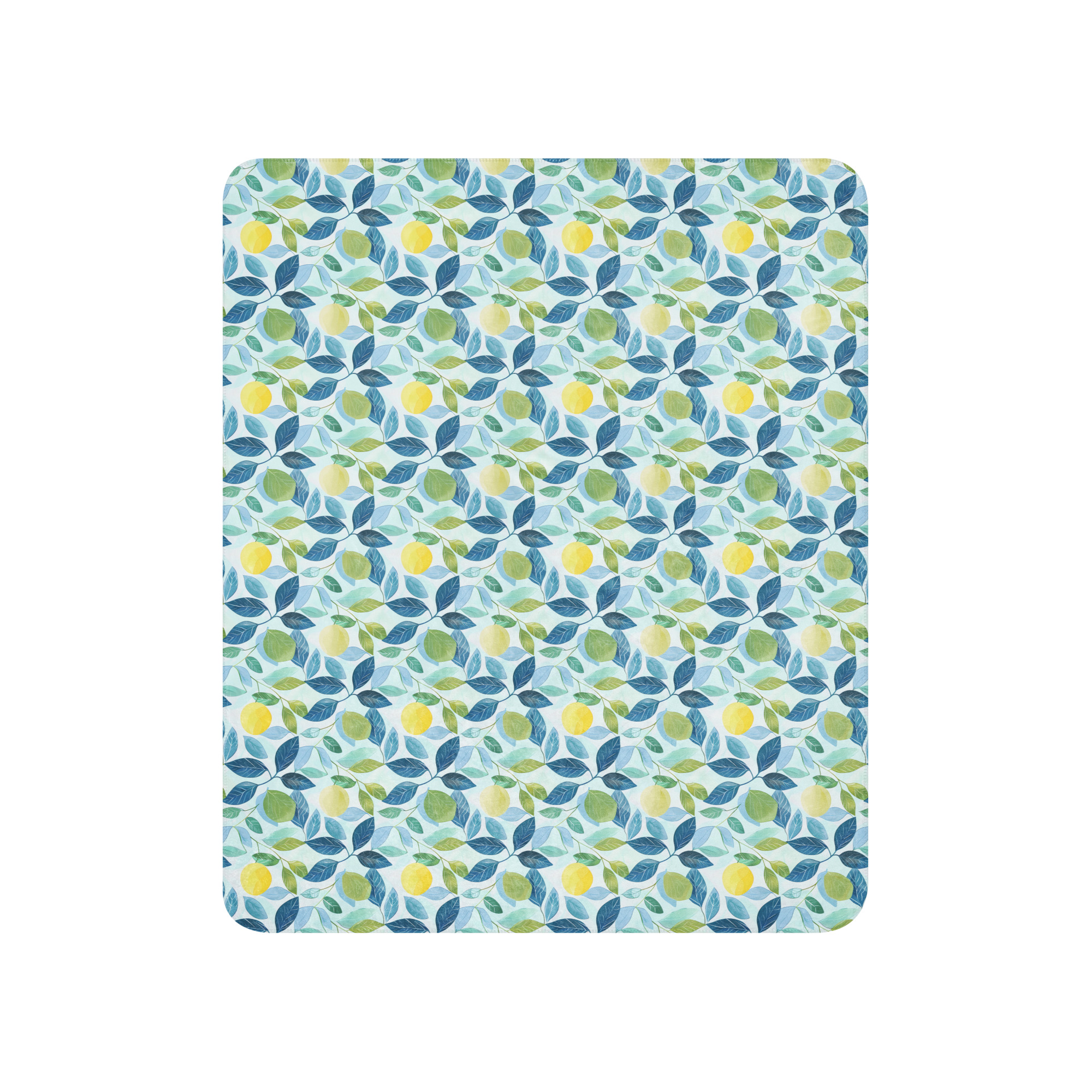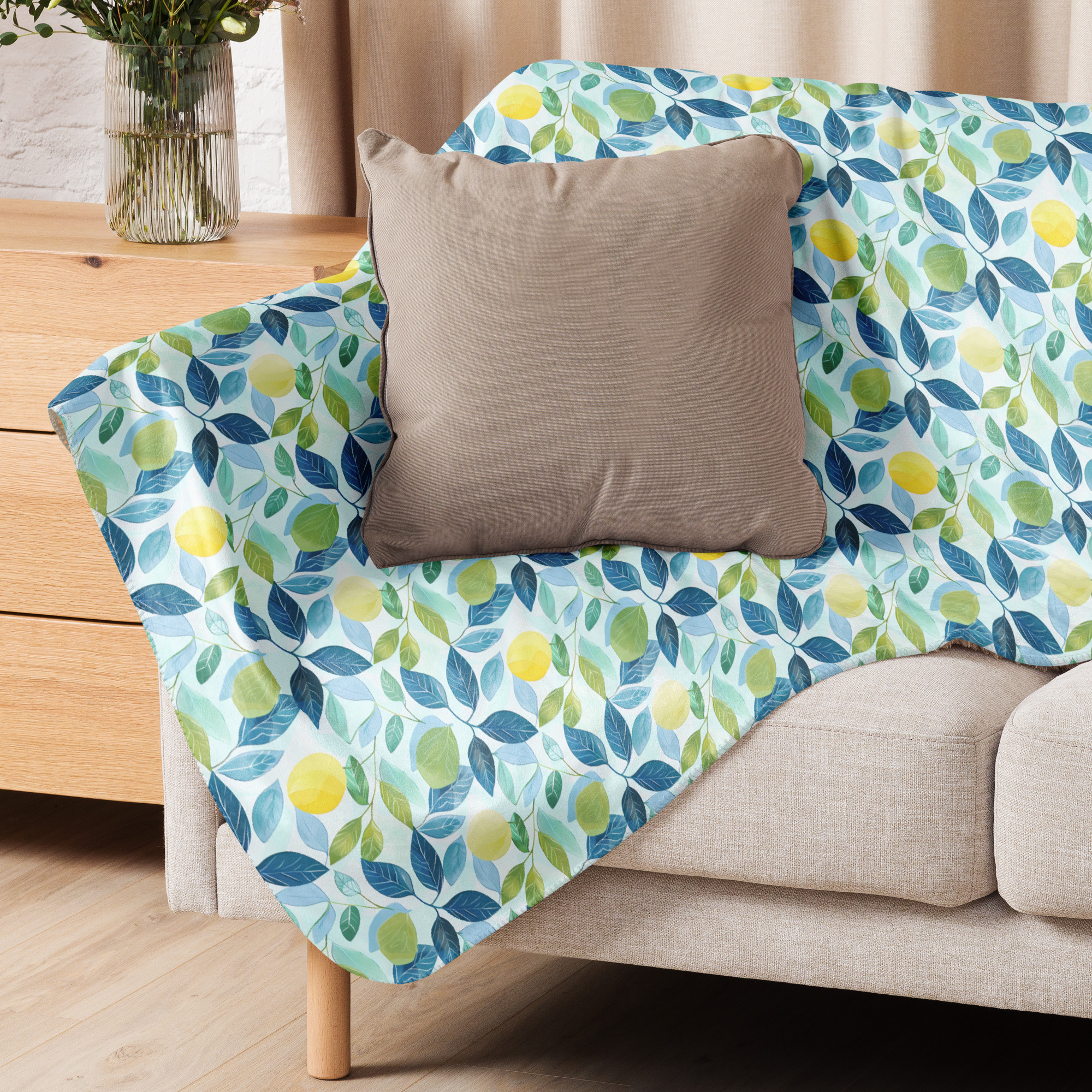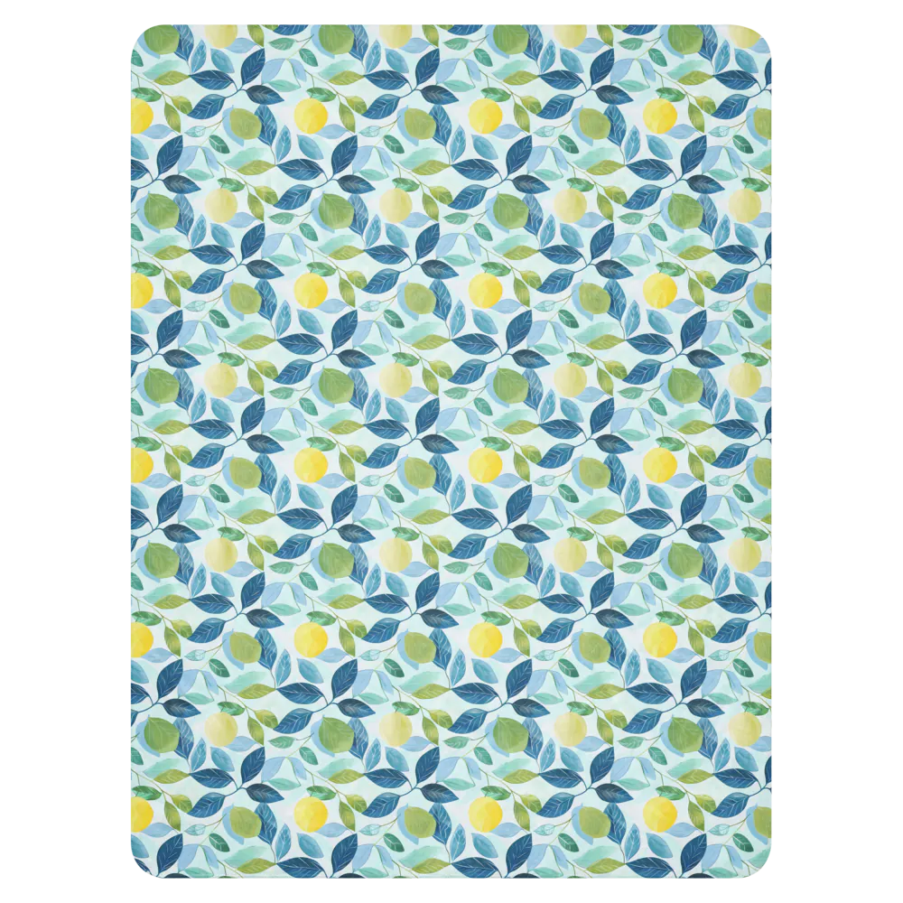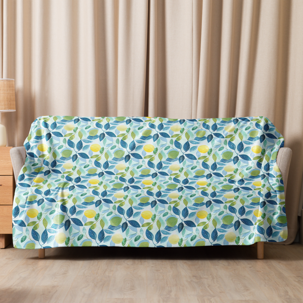 Botanical sherpa blanket with a vibrant lemon design. Soft fleece front and plush sherpa backing, available as a cozy throw or oversized blanket.
