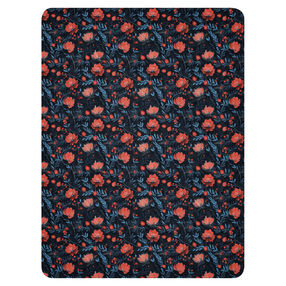 Moody floral sherpa throw blanket featuring deep berry tones on a dark backdrop. Smooth fleece front with plush sherpa backing for cozy, dramatic comfort.