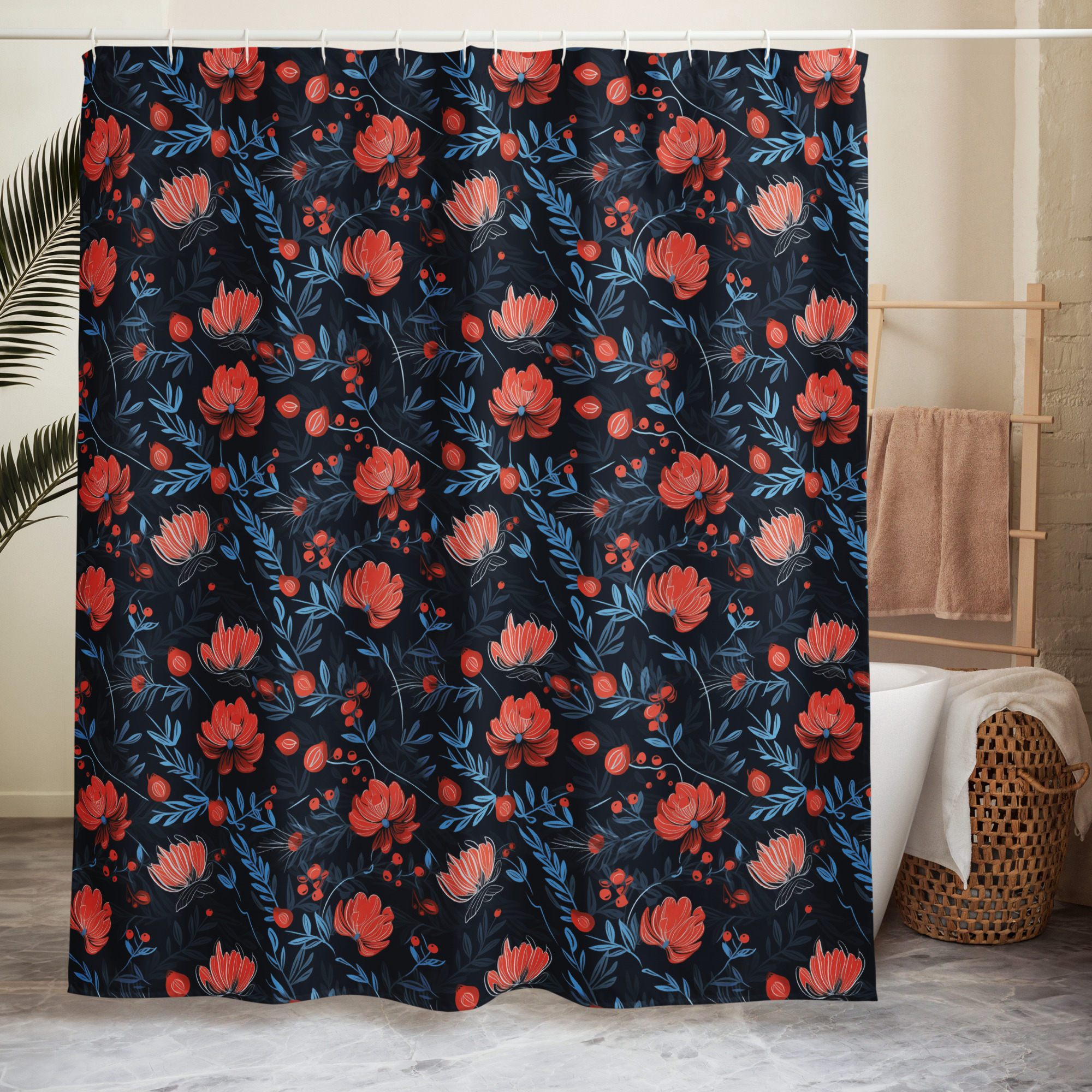 Bold yet romantic, the Midnight Berry Blooms shower curtain showcases deep berry tones against a rich dark backdrop. Its floral design adds both drama and beauty, making your bathroom feel inviting and luxurious.