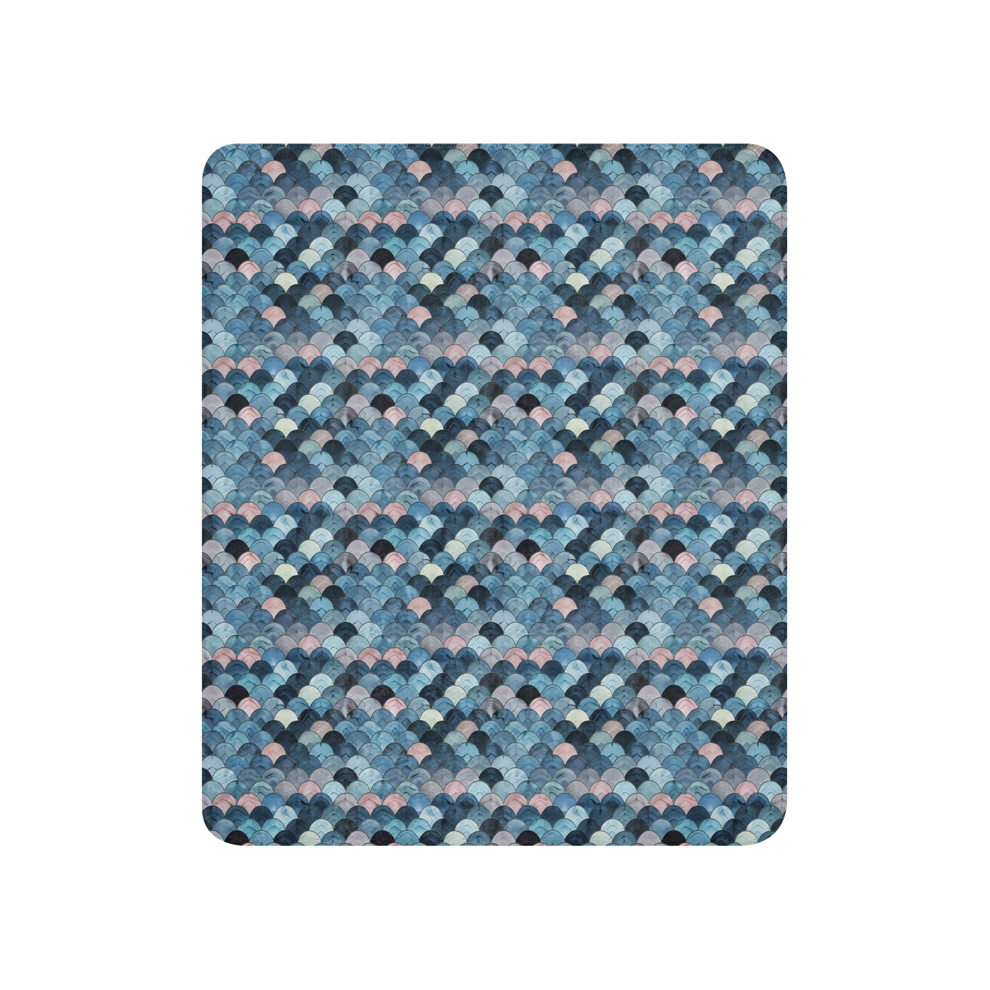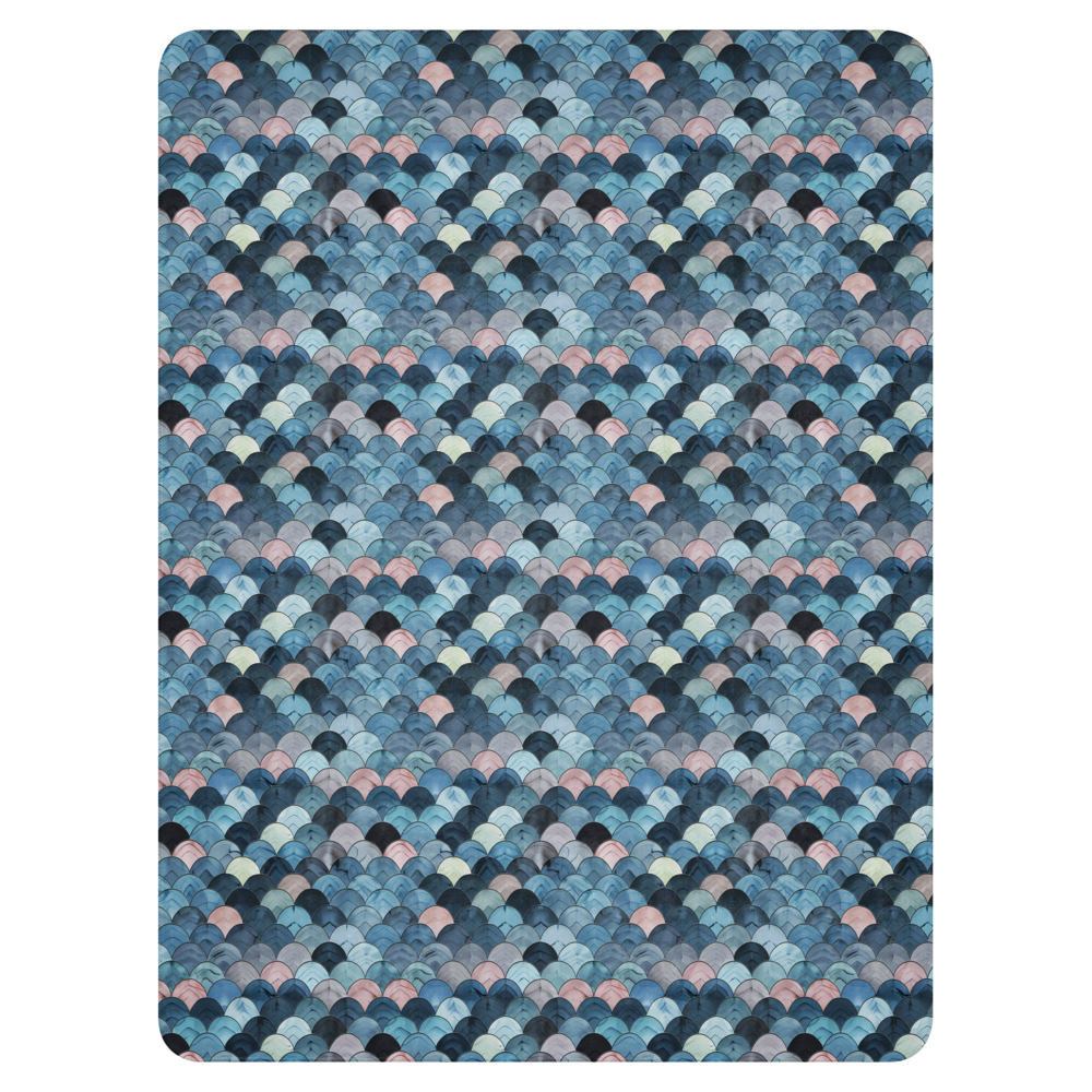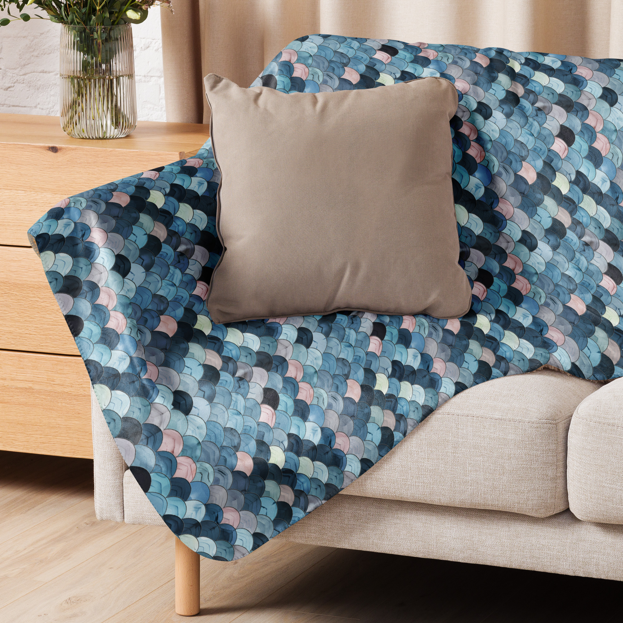 Coastal sherpa blanket featuring layered ocean-inspired scales in soothing blues. Soft fleece front with plush sherpa backing for cozy, everyday comfort.