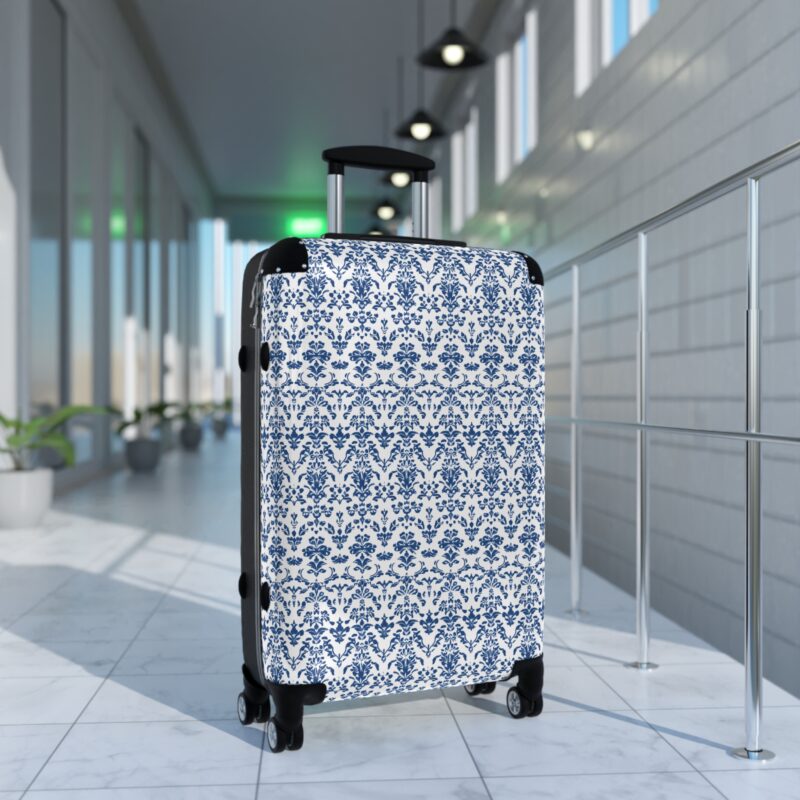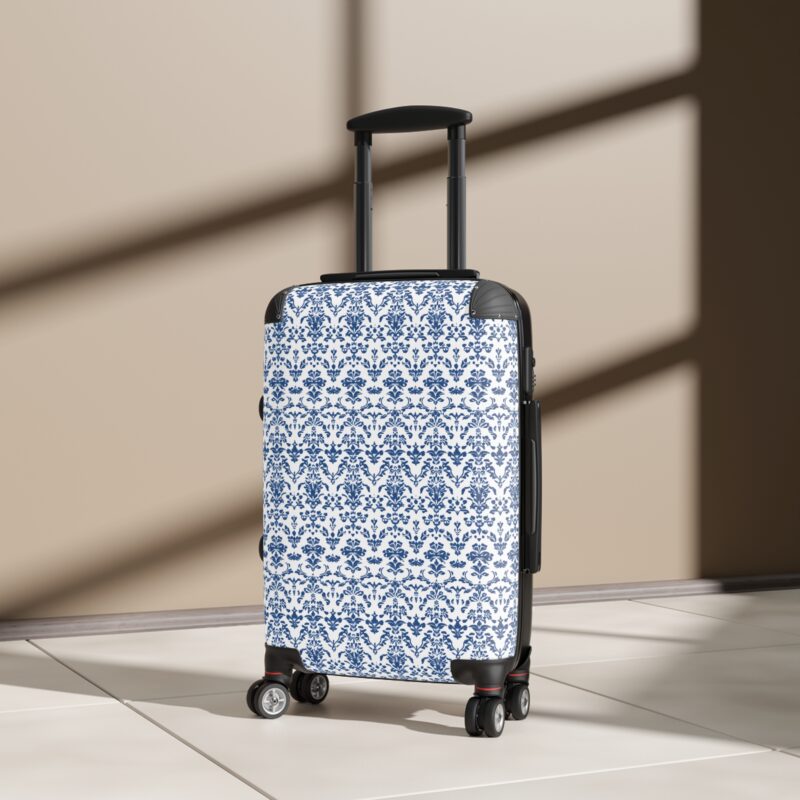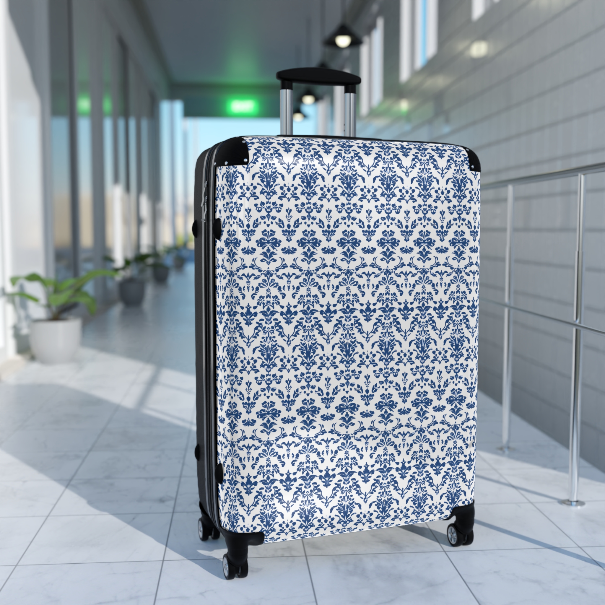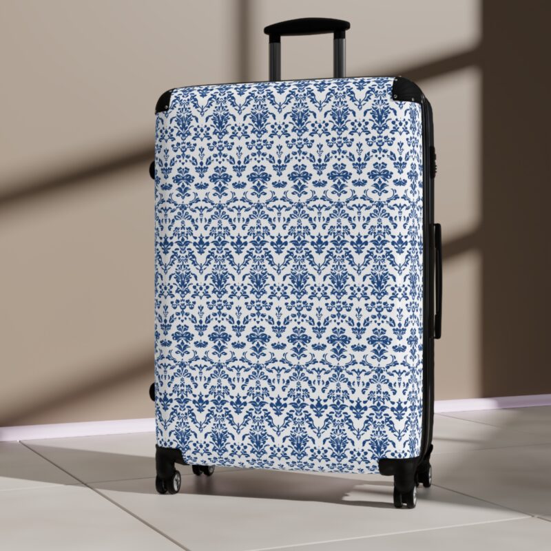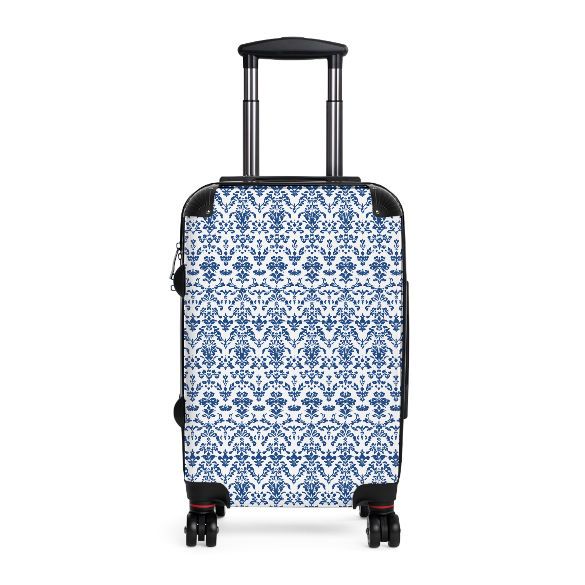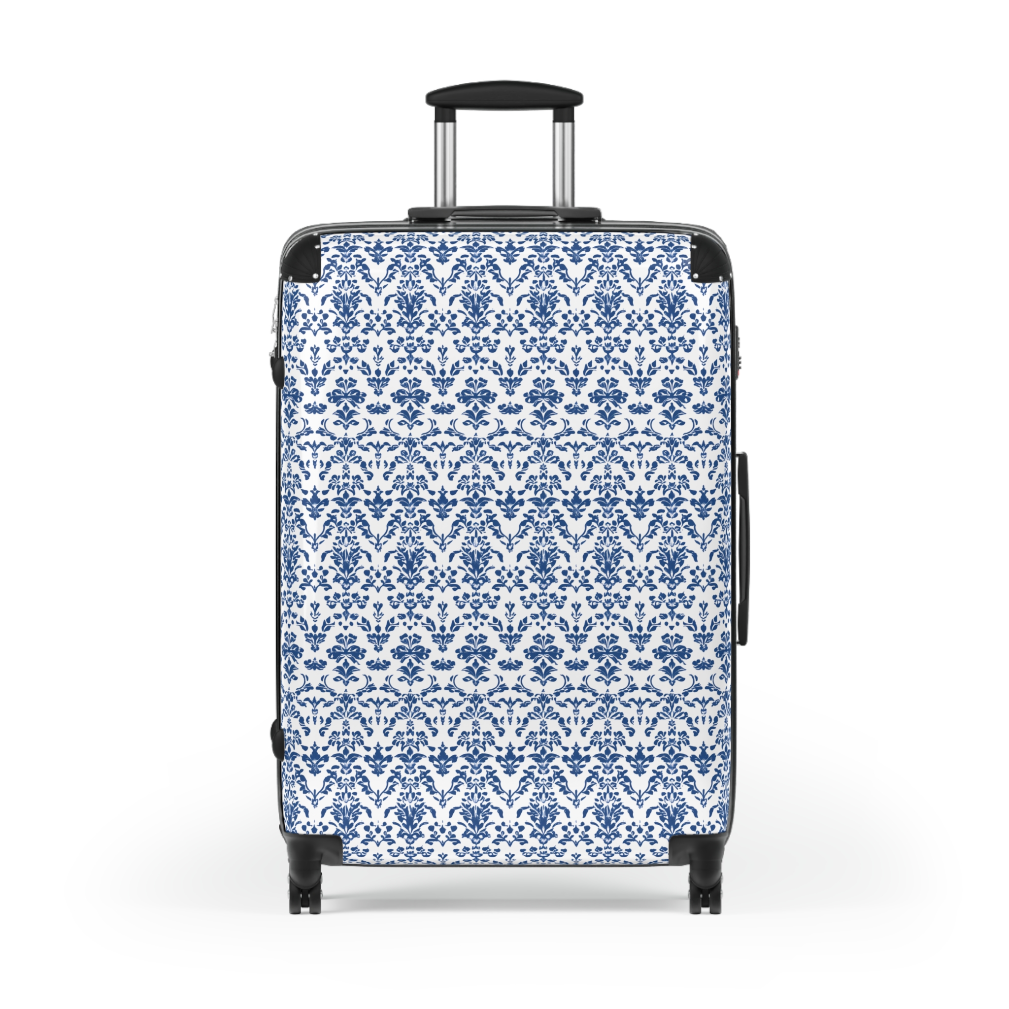 Travel with timeless sophistication using the Royal Heirloom Suitcase. Crafted with a sturdy hard-shell exterior and effortless 360° swivel wheels, it blends function with refined elegance. The delicate blue-and-white damask pattern recalls classic motifs, making your luggage a true statement piece while protecting your essentials.